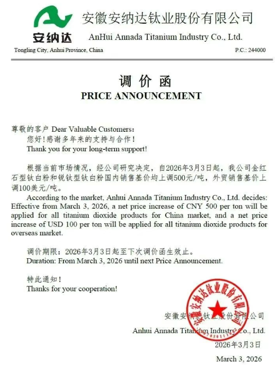 压力之下,2月24日至3月4日全行业掀起密集提价潮。宜宾天原、山东祥海、中信钛业率先在2月底调涨500元/吨;3月1日后,攀枝花海峰鑫、龙佰集团、潜江方圆、金海钛业等迅速跟进;3月3日当天,安纳达、内蒙古国城、广西金茂、富民龙腾等十余家企业集体宣涨;次日,国际巨头特诺宣布上调150美元/吨。